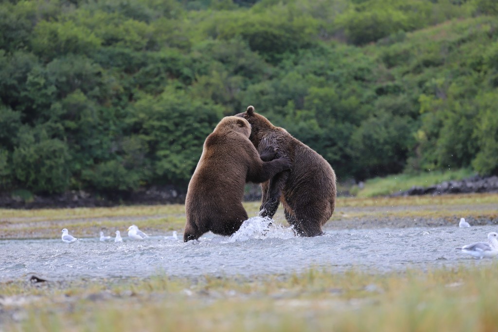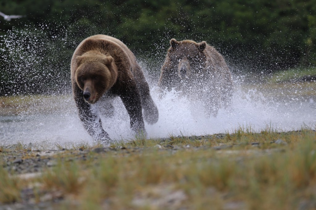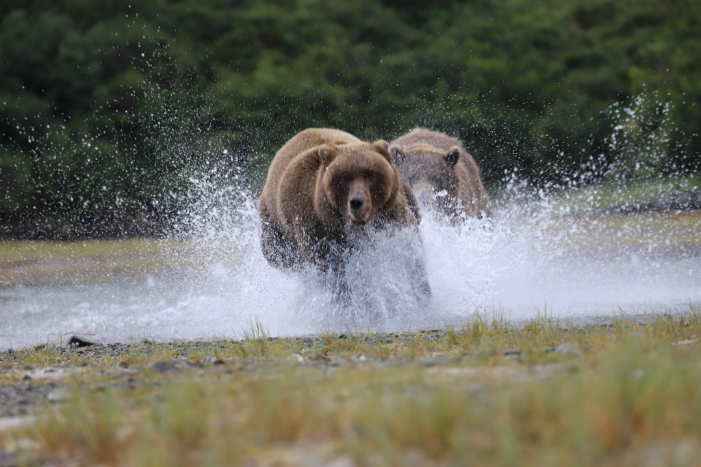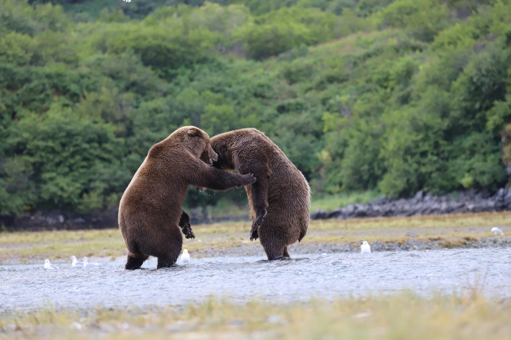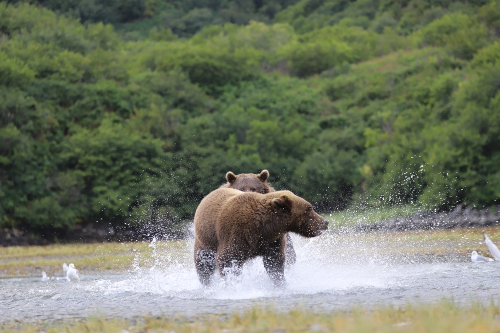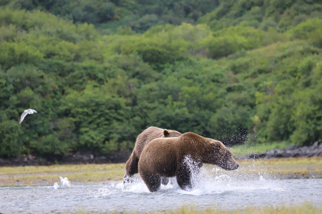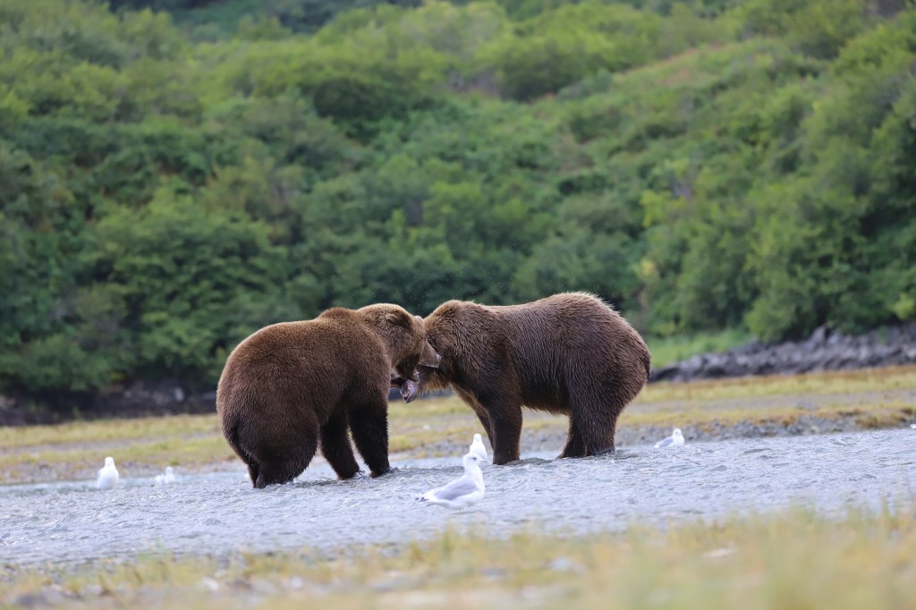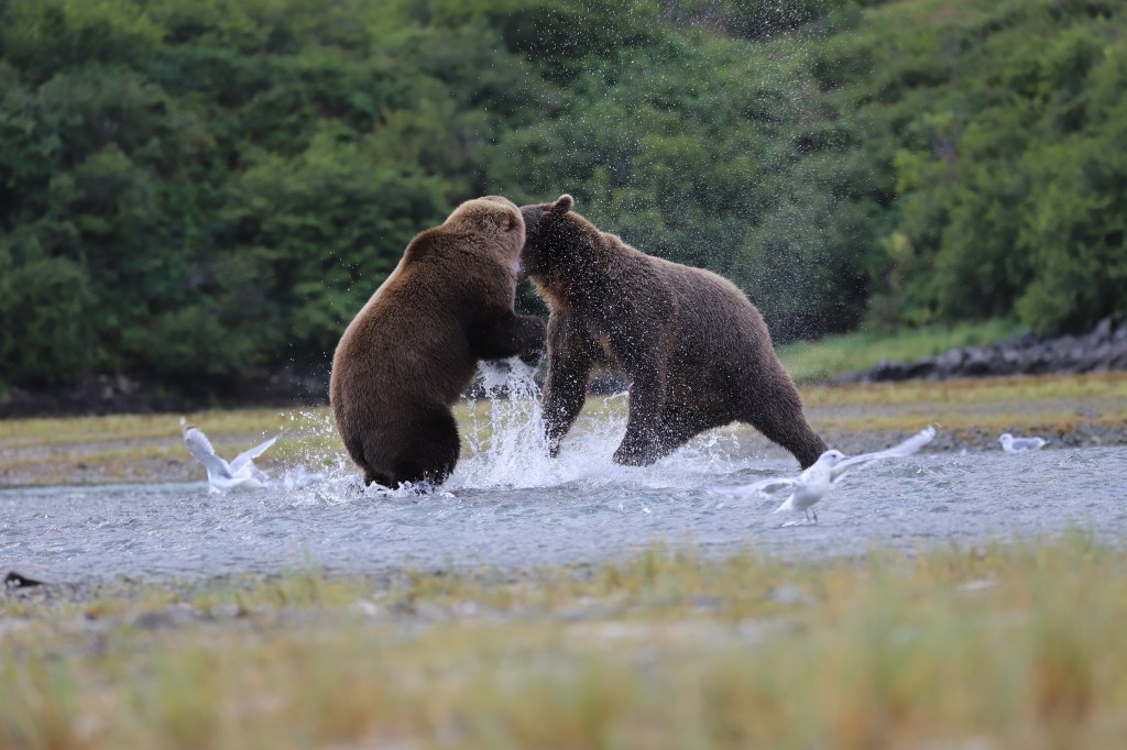 These two lovebirds were on what could only be described as a date that’s longer than a Netflix binge. Brown bears, it turns out, have a mating routine that rivals a Shakespearean drama. The bigger bear, being the bruin of the hour, clearly flubbed something on this fishing expedition, triggering a symphony of growls and a dramatic slap! Our girl decided she was done with dinner and took off like a furry rocket, but not before throwing a glance back, as if to say, “No hard feelings, right?” She dodged the lower half of our group with Olympic precision! The gentleman bear stopped dead in his tracks when I stepped out ready to flash my flare, making sure he got the memo that this wasn’t a game of “Red Rover, Red Rover, send Bob the bear right over!” Luckily, one of our clients was there to catch the whole fiasco on his iPhone—while Star was chillin’ up top snapping pics and I was holding the fort at the bottom. Just another day in Katmai, where even bears face the drama of love!