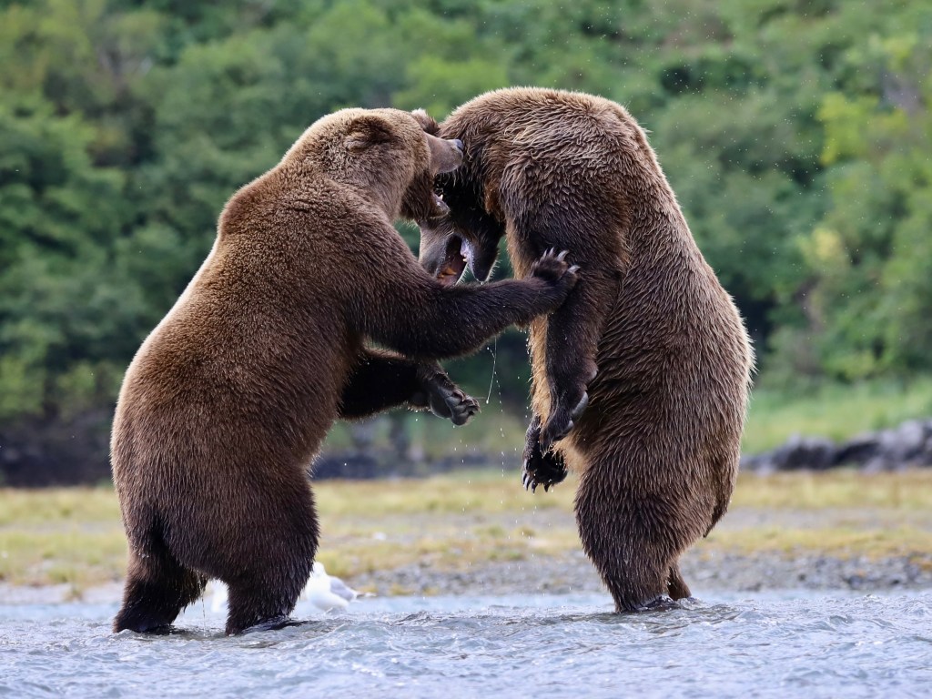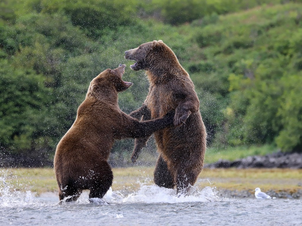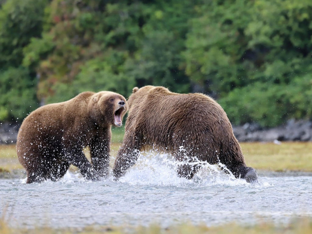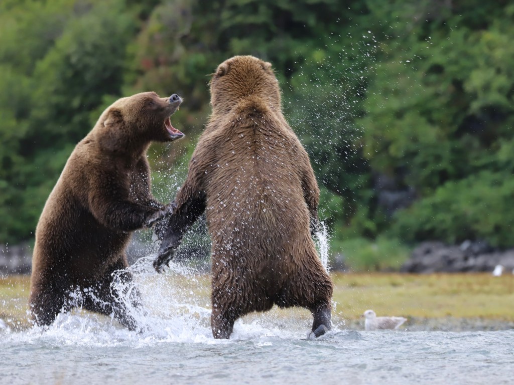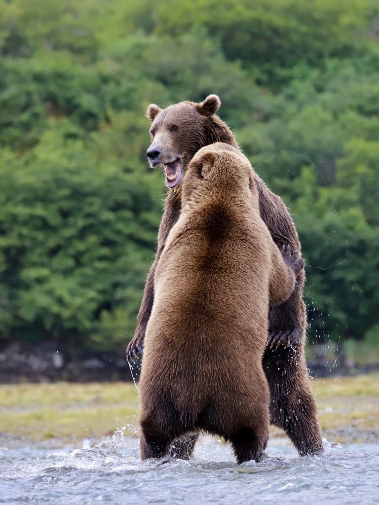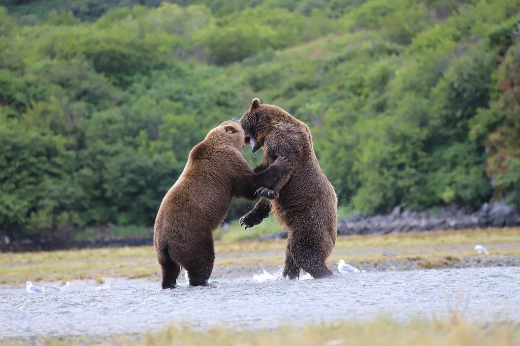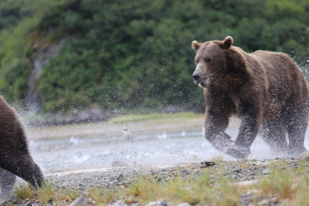 These two lovebirds were on what could only be described as a date that’s longer than a Netflix binge. Brown bears, it turns out, have a mating routine that rivals a Shakespearean drama. The bigger bear, being the bruin of the hour, clearly flubbed something on this fishing expedition, triggering a symphony of growls and a dramatic slap! Our girl decided she was done with dinner and took off like a furry rocket, but not before throwing a glance back, as if to say, “No hard feelings, right?” She dodged the lower half of our group with Olympic precision! The gentleman bear stopped dead in his tracks when I stepped out ready to flash my flare, making sure he got the memo that this wasn’t a game of “Red Rover, Red Rover, send Bob the bear right over!” Luckily, one of our clients was there to catch the whole fiasco on his iPhone—while Star was chillin’ up top snapping pics and I was holding the fort at the bottom. Just another day in Katmai, where even bears face the drama of love!